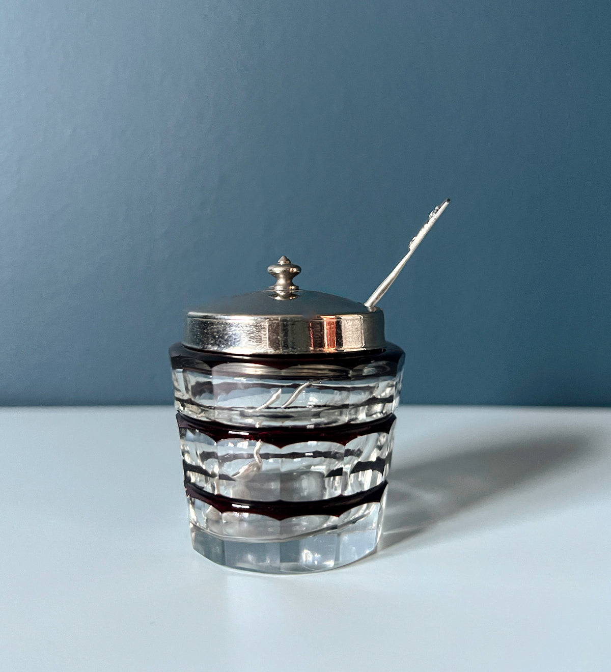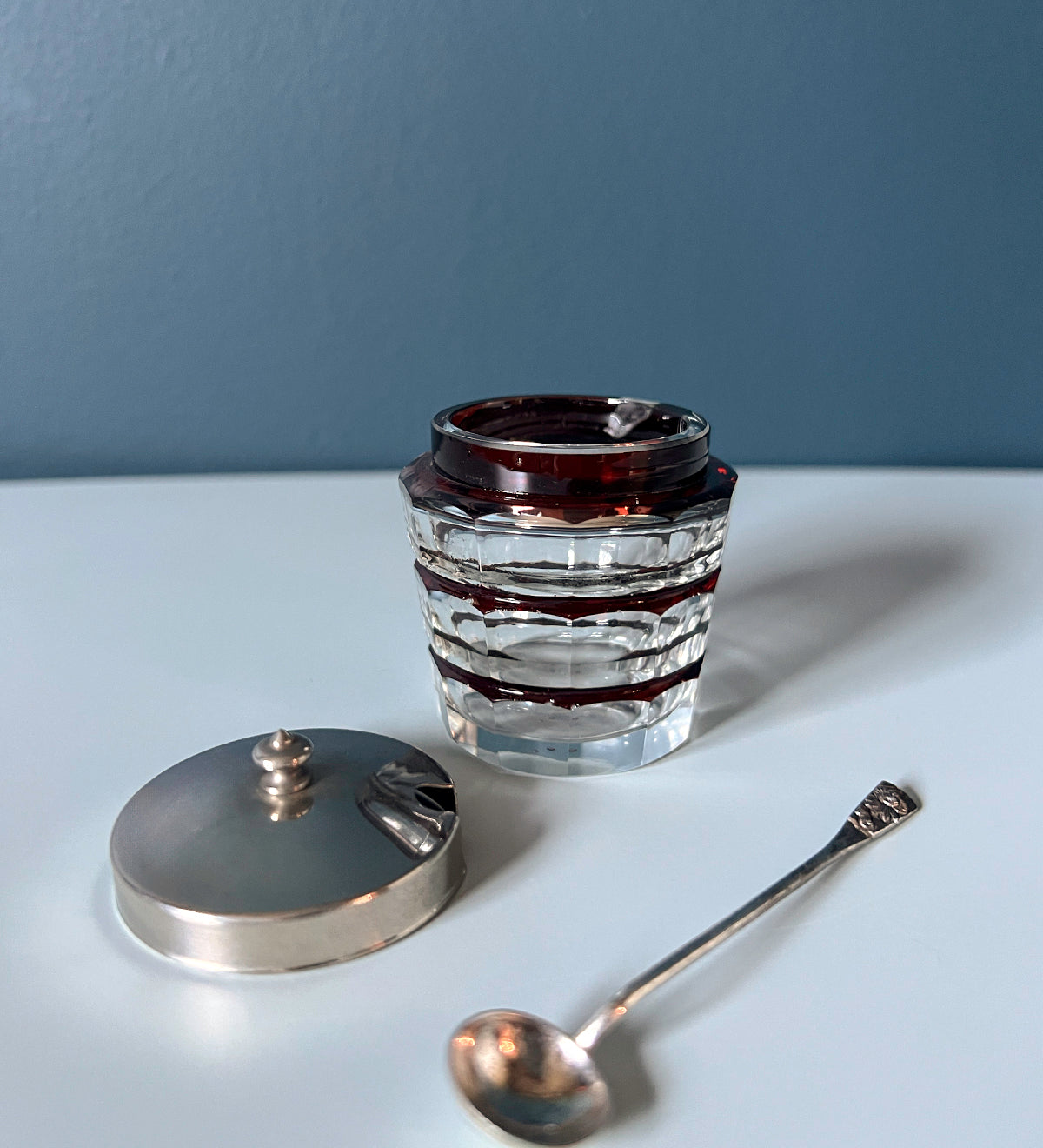 Vintage Glass Salt Cellar with Metal Lid and Spoon