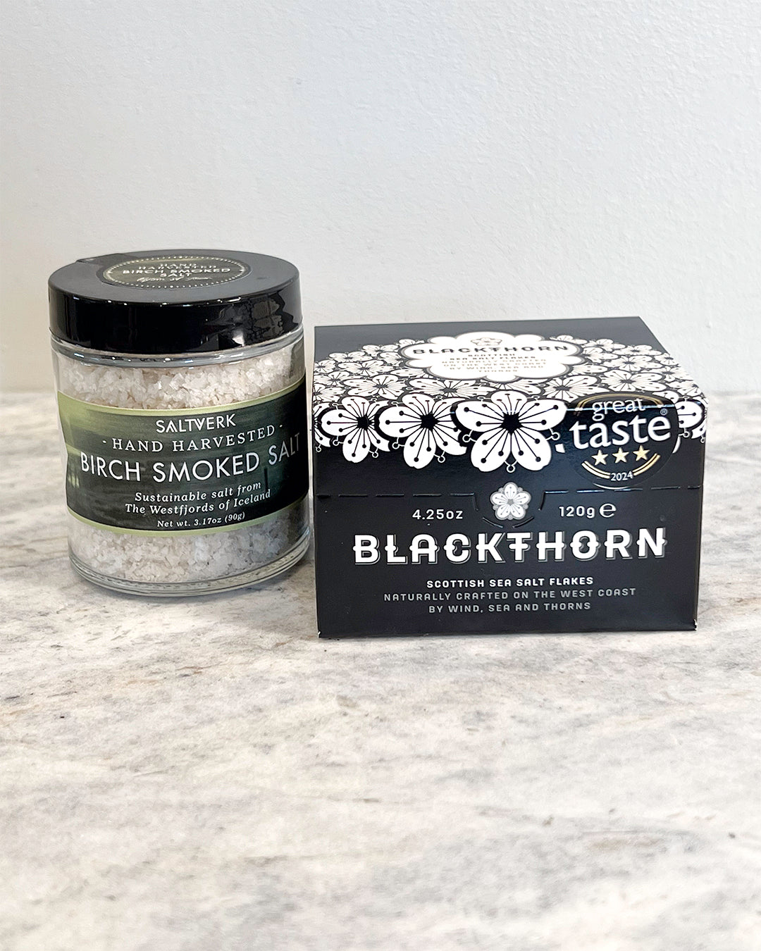 Delicate finishing salt dried with the wind over a tower of blackthorn branches. This creates a delicate flake with a touch of tannin from the branches. We love the paper box, but keep ours in a cellar on the table for everyday use.
