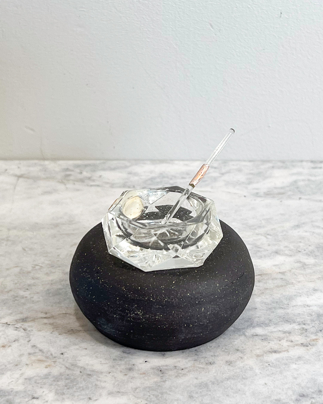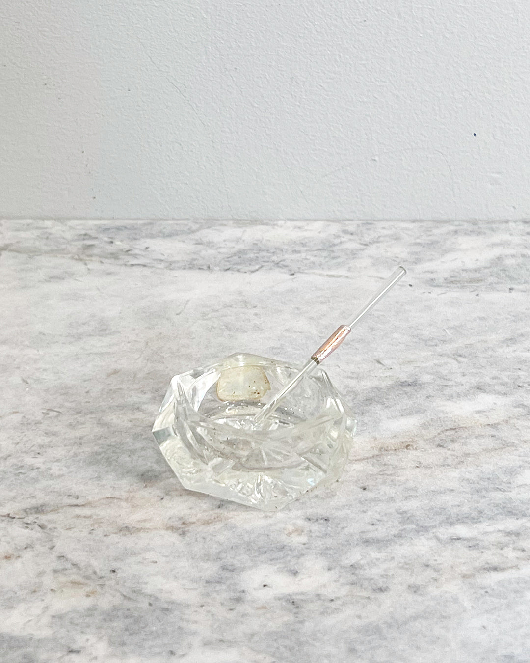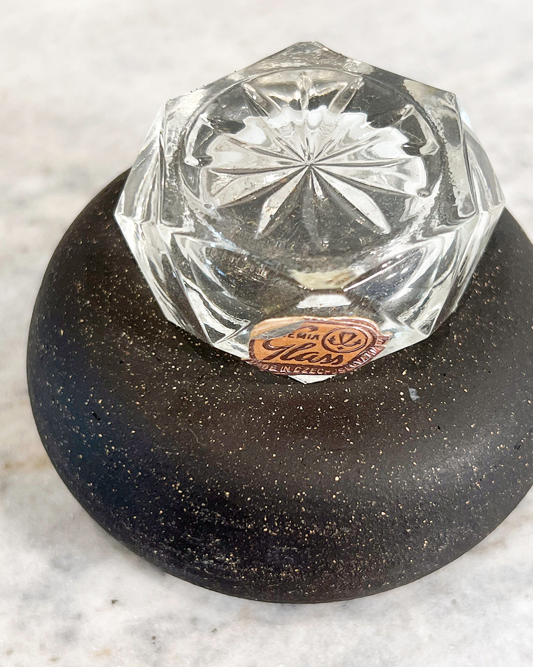 Bohemian Glass from Czechoslovakia, Beveled Star Burst Pattern. These little gems still have the sticker as we found them in a set with the spoons. Sold in pairs, these are perfect for finishing salts on the table.